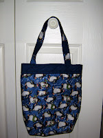 From the bags I made and donated to the Frost Festival in February I received a number of orders for a variety of bags. Many wanted penguin fabrics so that next year these will all be sported about town during the Festival. I also received a nice order for quilted bags and these are becoming alot of fun to create. This first bag I am showing here is a Market Bag and I lined it, because the lady wanted something different than the usual style for when she went shopping.
